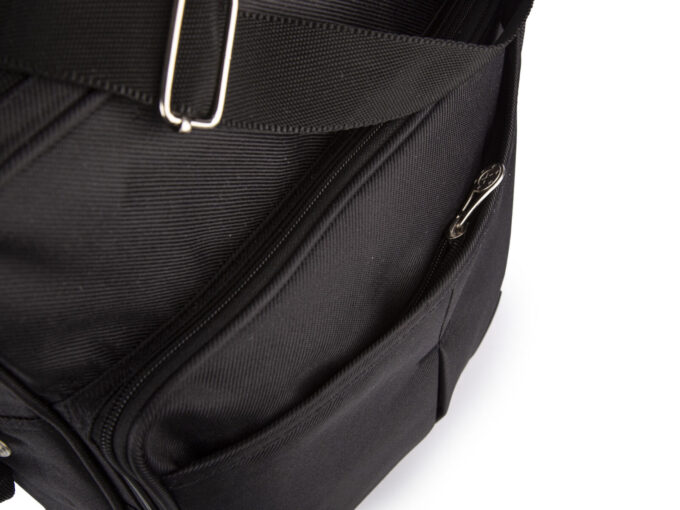 - Z przodu torby znajduje się druga, mniejsza komora na podręczne akcesoria. Na niej, dodatkowa kieszeń zapinana na poziomy „ukryty” suwak.