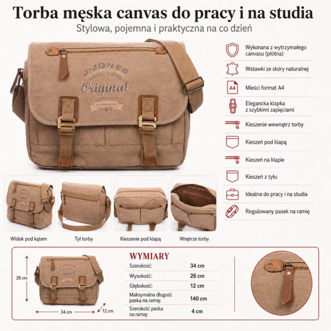 - Wykonana z najwyższej jakości, wytrzymałych materiałów – canvasu (płótna) z licznymi wstawkami wykonanymi ze skóry naturalnej,