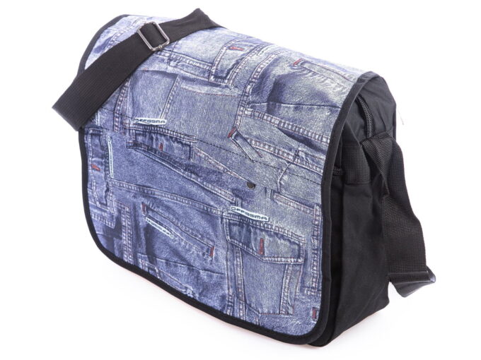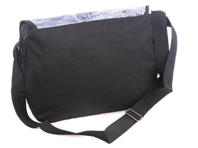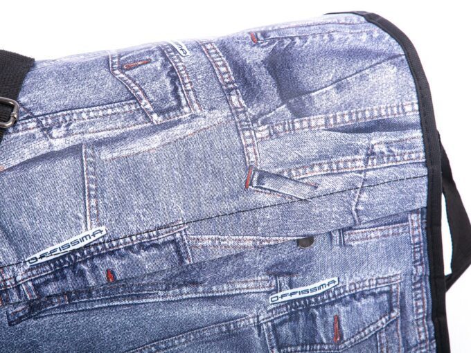 Cechuje ją przemyślana konstrukcja, która bez problemu pomieści dokumenty w formacie A4, drugie śniadanie, butelkę z wodą i wszelkie niezbędne na co dzień akcesoria. Wykonana została z gładkiego i przyjemnego w dotyku, odpornego na zabrudzenia poliestru z wewnętrzną, nieprzemakalną membraną, co gwarantuje długotrwałe i bezproblemowe użytkowanie. Dodatkowo, klapka torby ozdobiona jest oryginalnymi wzorami niebieskiego jeansu i czarnym, dodającym jej unikalnego charakteru.