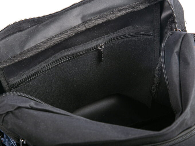 - Pojemna komora główna, mieszcząca format A4, zapinana na zamek błyskawiczny umieszczony pod klapą zamykaną na dwa rzepy.