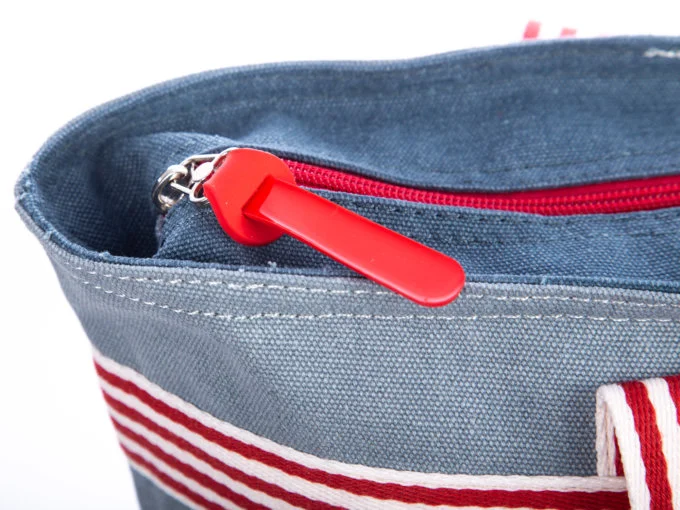 - Torba posiada długie i szerokie uchwyty do trzymania w ręce w stylowe czerwono-białe paski.