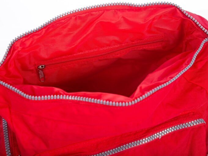 - Czerwona torebka wykonana z lekkiego materiału – kreszu, o dużej odporności na przemakanie,