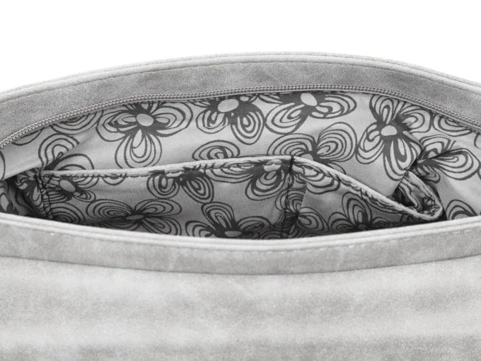 - Torebka damska szara, wykonana z wysokiej jakości skóry ekologicznej, imitującej zamsz/nubuk. Jest ona również bardzo miękka i przyjemna w dotyku.