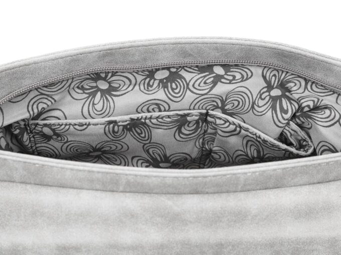 Czasy gdy skóra ekologiczna kojarzyła się ze słabej jakości, sztywnym materiałem nigdy nie były obecne w sklepie LadneTorby.pl. Oferujemy Państwu tylko torebki wykonane ze sprawdzonych, najwyższej jakości skór eko. Podobnie jest w tym przypadku. Prezentowana szara torebka damska stworzona została również ze skóry syntetycznej najwyższej jakości, jest ona mięciutka i wytrzymała. W dotyku przypomina nubuk lub zamsz. Jej powierzchnia jest półmatowa – pod mocniejszym światłem lekko błyszcząca.