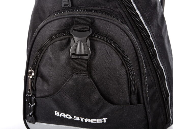 - Z przodu, na dole plecak wyposażono w odblaskowy pasek w kolorze szarym.