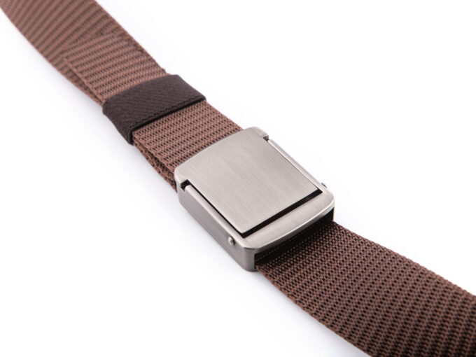 - Ciemnobrązowy, bardzo mocny, nylonowy pasek męski do spodni z kolekcji PHANTOM z solidną, metalową klamrą zaciskową.