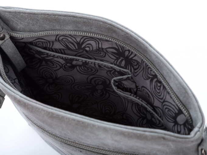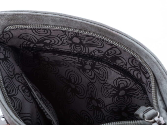 - Wewnątrz torebki znajdują się dwie kieszonki otwarte (na telefon i klucze) oraz kieszonka zapinana na dodatkowy suwak na cenniejsze przedmioty.