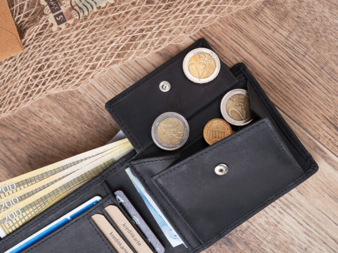 - Kieszonka na bilon zapinana na patkę z mocnym, metalowym zatrzaskiem.