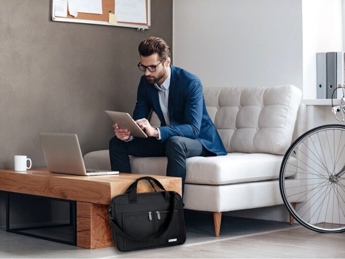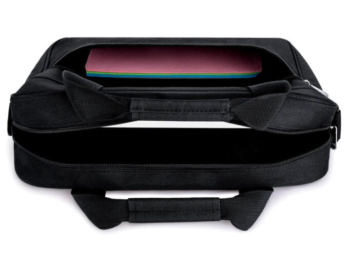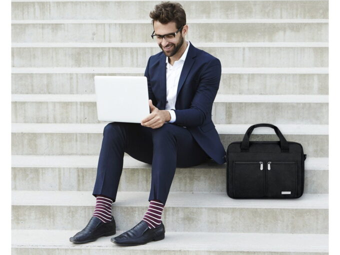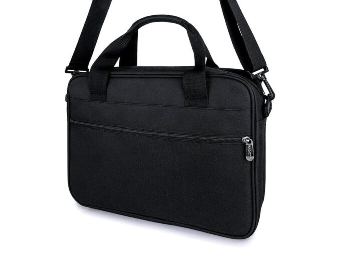 - Czarna torba męska do pracy z miejscem na laptopa.