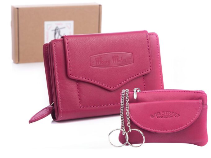Różowy zestaw prezentowy z miękkiej, naturalnej skóry: praktyczny portfel damski z ochroną RFID, miejscem na 8 kart, przegródkami na banknoty i zapinaną kieszenią na monety oraz dopasowane etui na klucze z łańcuszkami, elegancko zapakowane w pudełko — idealne na prezent. Pełna specyfikacja ⬇