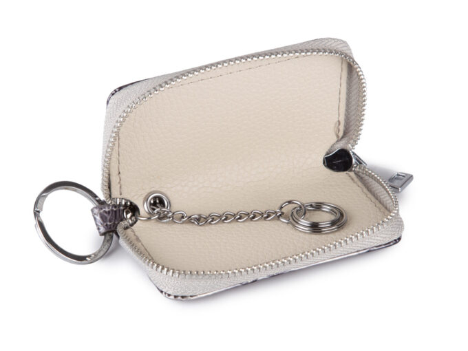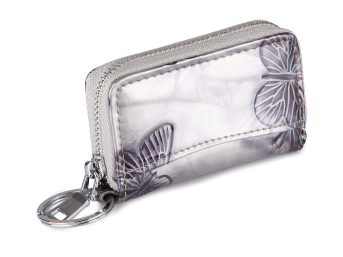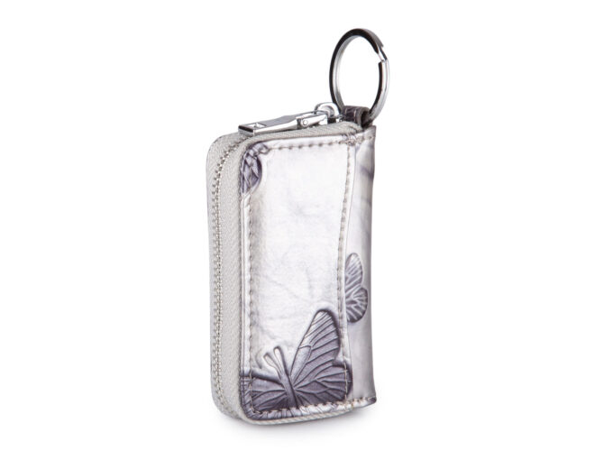- Damskie etui na klucze, lakierowane, srebrne z tłoczeniem w motylki.