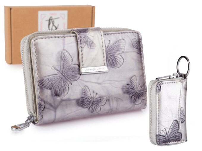 Stylowy, srebrny zestaw prezentowy Jennifer Jones dla kobiet — lakierowany portfel z tłoczonymi motylkami wykonany z naturalnej skóry z zabezpieczeniem RFID, 9 kieszonkami na karty, dwiema przegrodami na bilon, przegródką na banknoty i dwoma okienkami na dokumenty oraz dopasowane etui na klucze z metalowym uchwytem i zamkiem, wszystko zapakowane w eleganckie pudełko. Pełna specyfikacja ⬇