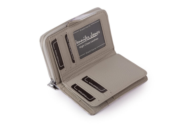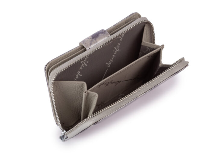 - Portfel zapinany jest na paseczek z zatrzaskiem. Na pasku producent umieścił chromowaną blaszkę z logiem marki Jennifer Jones.