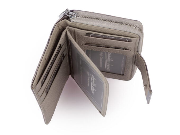 - Średni, lakierowany portfel damski w kolorze srebrnym, niemieckiej marki Jennifer Jones,