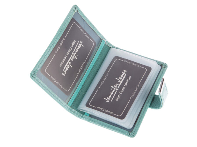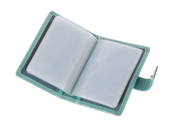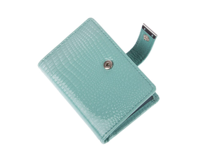 - Turkusowy wizytownik (Etui na dokumenty i karty) wykonany z lakierowanej skóry naturalnej,