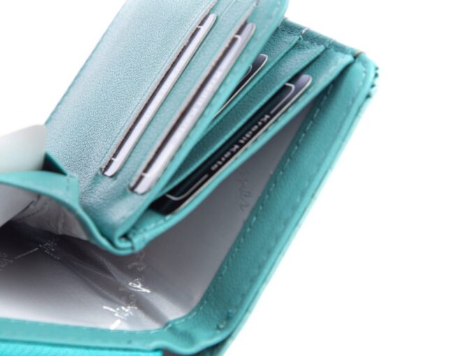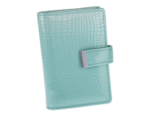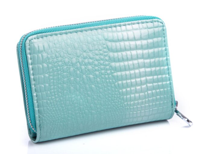 - Jasno-turkusowy portfel damski tłoczony na wzór croco.