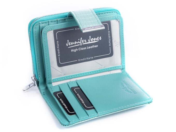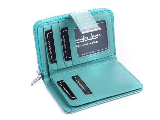 Stylowy turkusowy zestaw Jennifer Jones z lakierowanej skóry naturalnej — średniej wielkości portfel tłoczony na wzór croco z zabezpieczeniem RFID oraz dopasowany wizytownik na 18 kart, zapakowane w eleganckie pudełko — łączy efektowny wygląd z praktyczną organizacją i idealnie nadaje się na gotowy prezent. Pełna specyfikacja ⬇