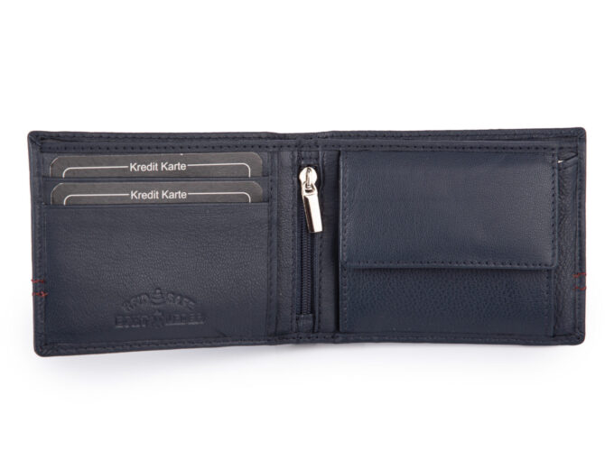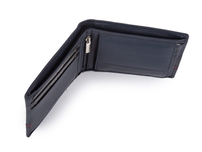 - Zgrabny, granatowy portfel męski z miękkiej skóry naturalnej z subtelnym detalem w postaci kontrastowego, czerwonego przeszycia.