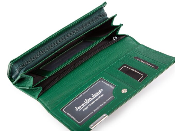 - Zielony lakierowany portfel damski niemieckiej marki Jennifer Jones.