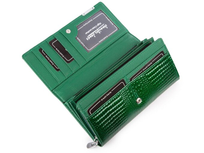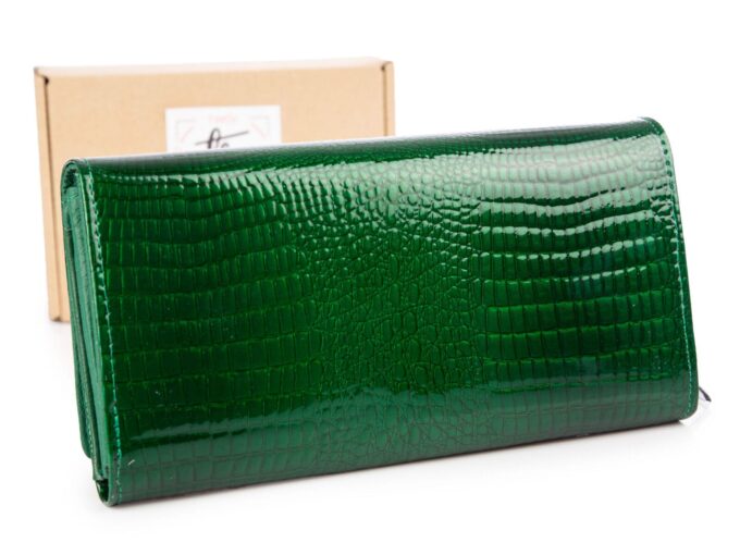 Zielony portfel damski lakierowany croco z kieszenią na monety na zamek wewnątrz