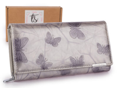 Duży poziomy portfel damski lakierowany z wzorem w tłoczone motylki srebrny
