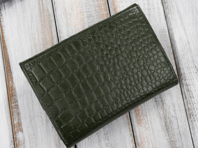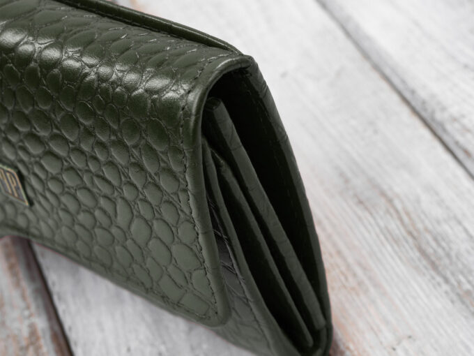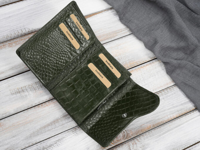 - Ciemnozielony, średni portfel damski skórzany z wzorem imitującym skórę krokodyla.