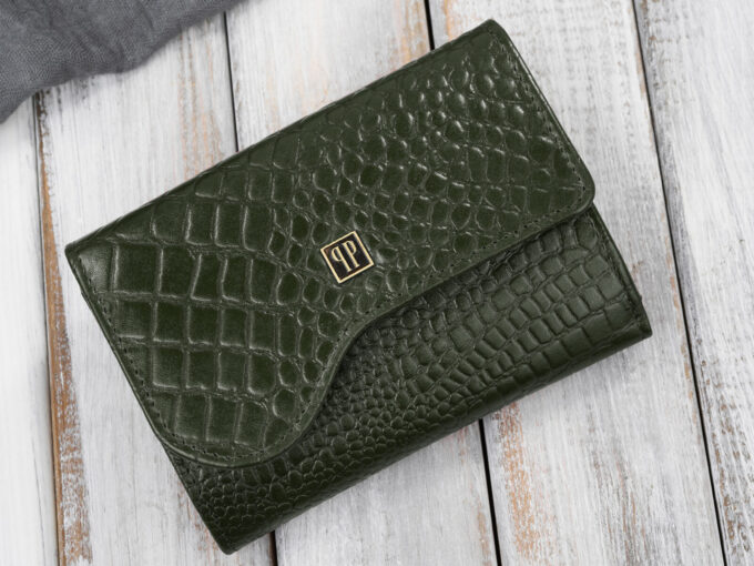Średniej wielkości, ciemnozielony portfel damski Paolo Peruzzi ze skóry naturalnej z eleganckim tłoczeniem croco — kompaktowy, zapinany na metalowy zatrzask, z ochroną RFID, 6 nieprzezroczystymi i 2 przezroczystymi kieszonkami na karty, dodatkowymi przegródkami na karty lojalnościowe i paragony, dwiema przegrodami na banknoty oraz zamykaną kieszonką na monety, sprzedawany w eleganckim pudełku, idealny na praktyczny i stylowy prezent. Pełna specyfikacja ⬇