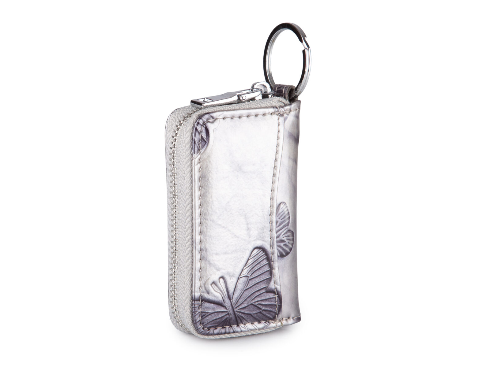 Damskie etui na klucze w srebrnym kolorze lakierowane w motylki marki Jennifer Jones