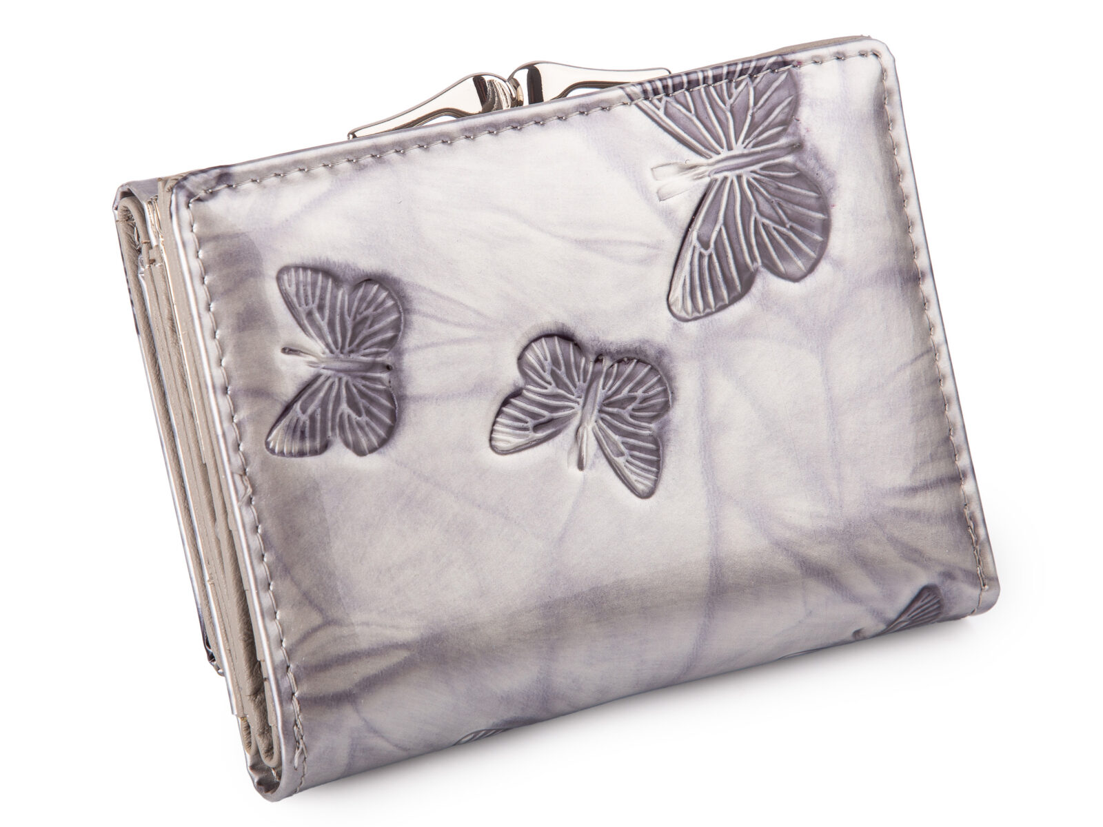 Pojemny srebrny portfel damski lakierowany w motylki zapinany na bigiel i zatrzask RFID