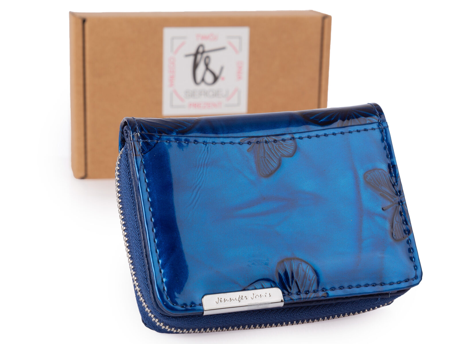 Mały portfel damski w motylki - niebieski, skórzany, lakierowany Jennifer Jones