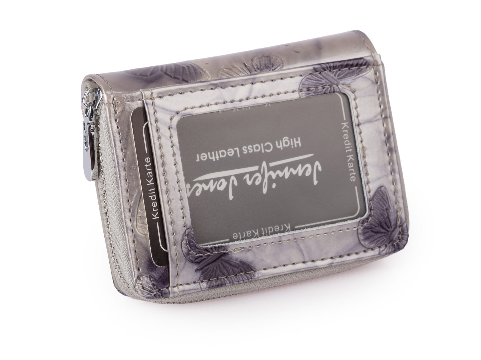 Mały portfel damski w motylki - srebrny, skórzany, lakierowany Jennifer Jones