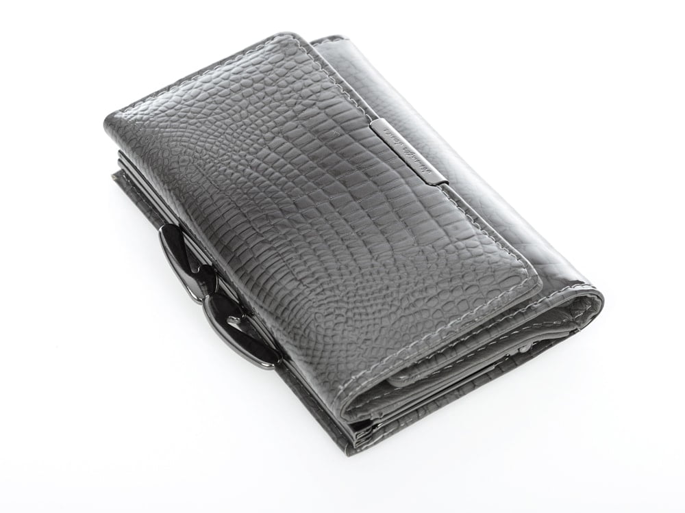 Lakierowany szary skórzany portfel damski na bigiel - Jennifer Jones