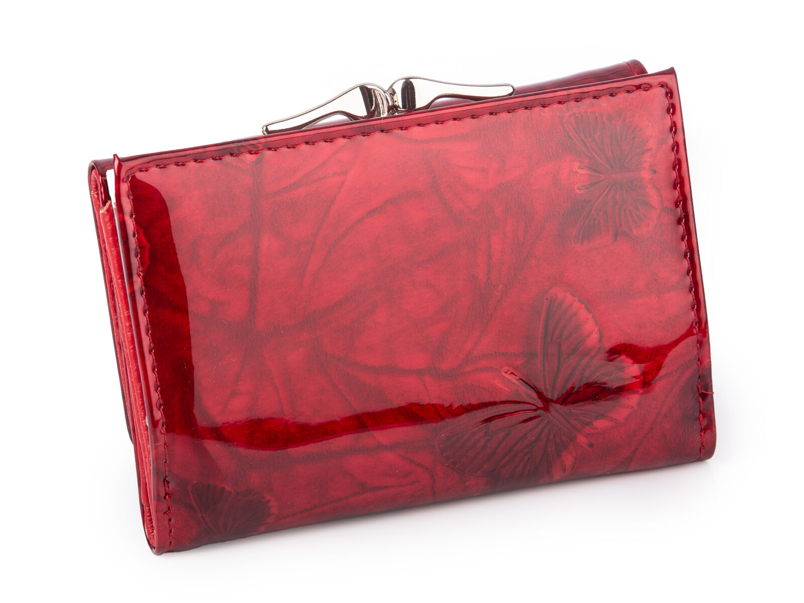 Lakierowany, średni portfel damski czerwony w motylki, zapinany na bigiel