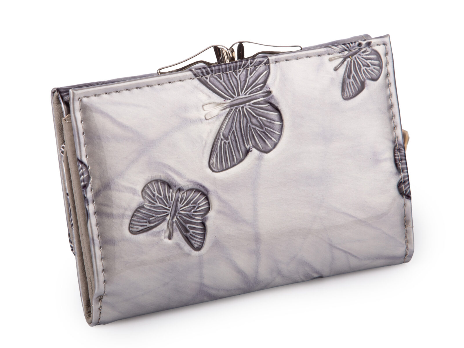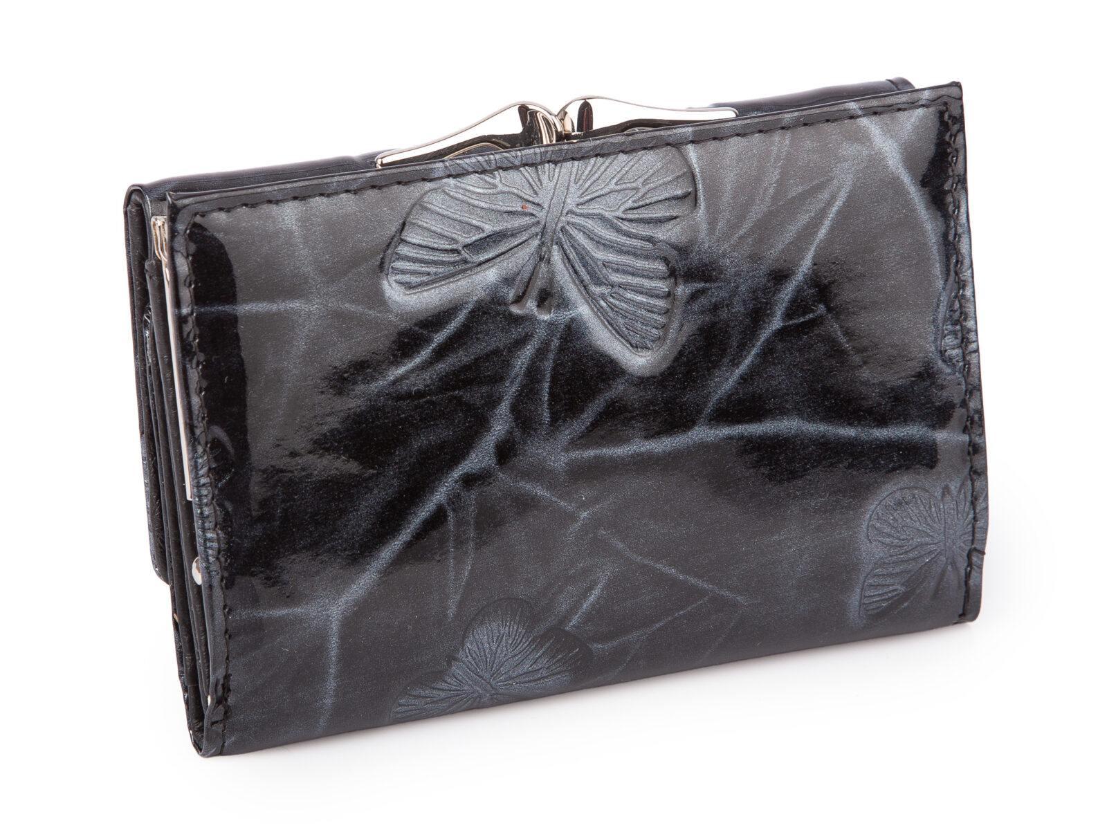 Lakierowany, średni portfel damski srebrny w motylki, zapinany na bigiel