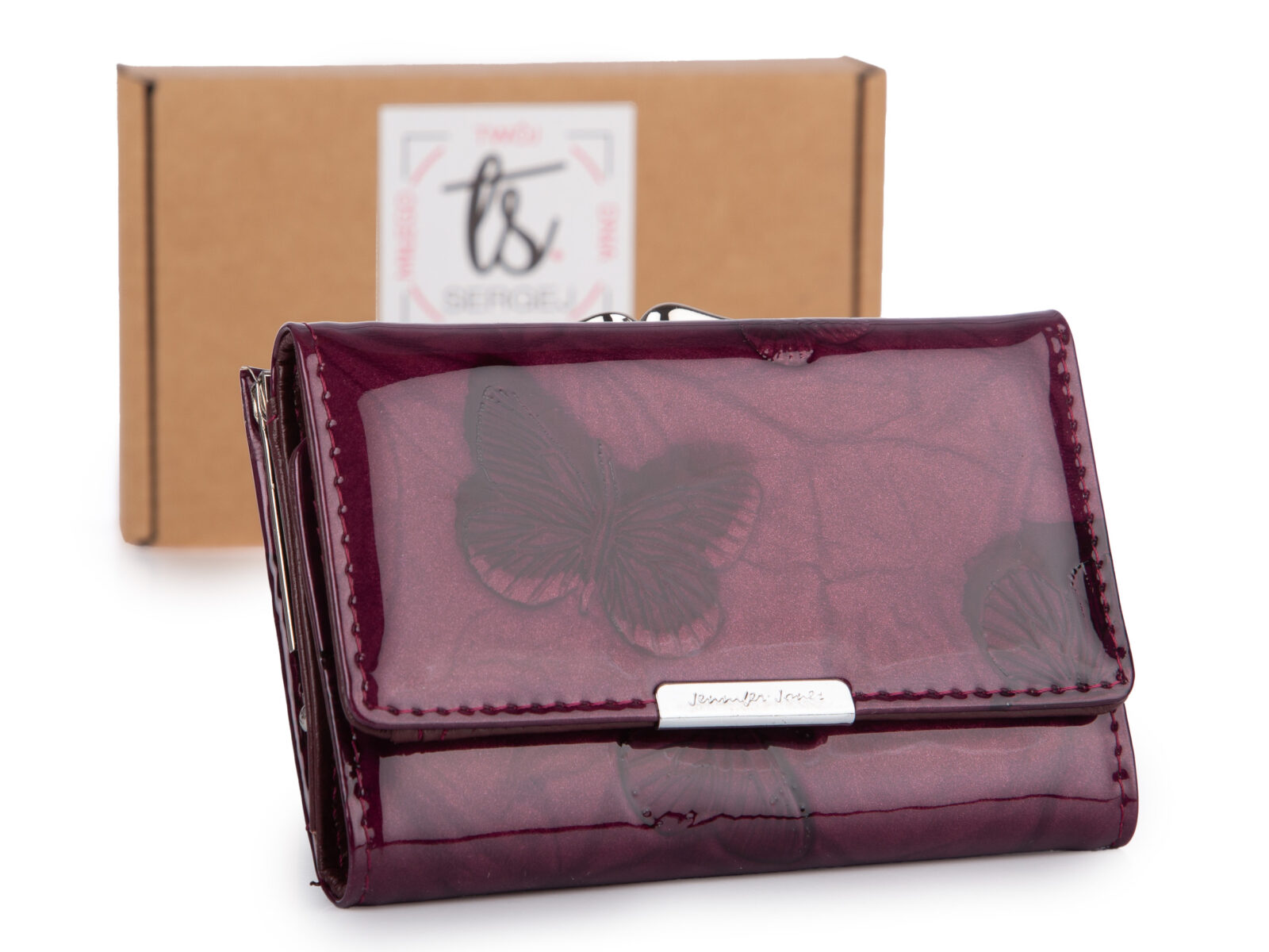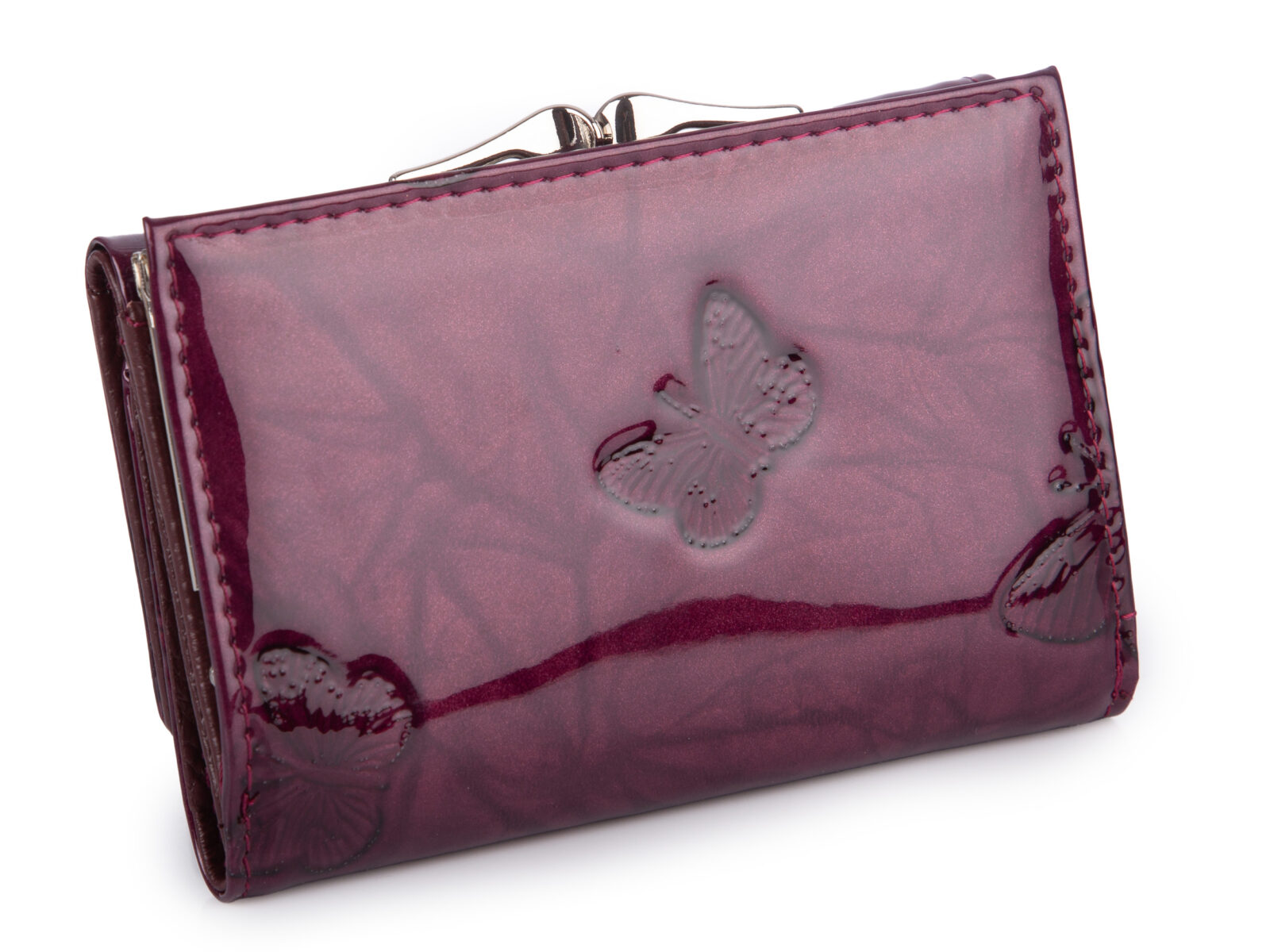 Lakierowany, średni portfel damski fioletowy w motylki, zapinany na bigiel