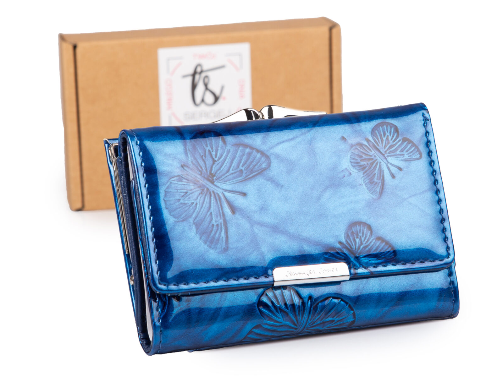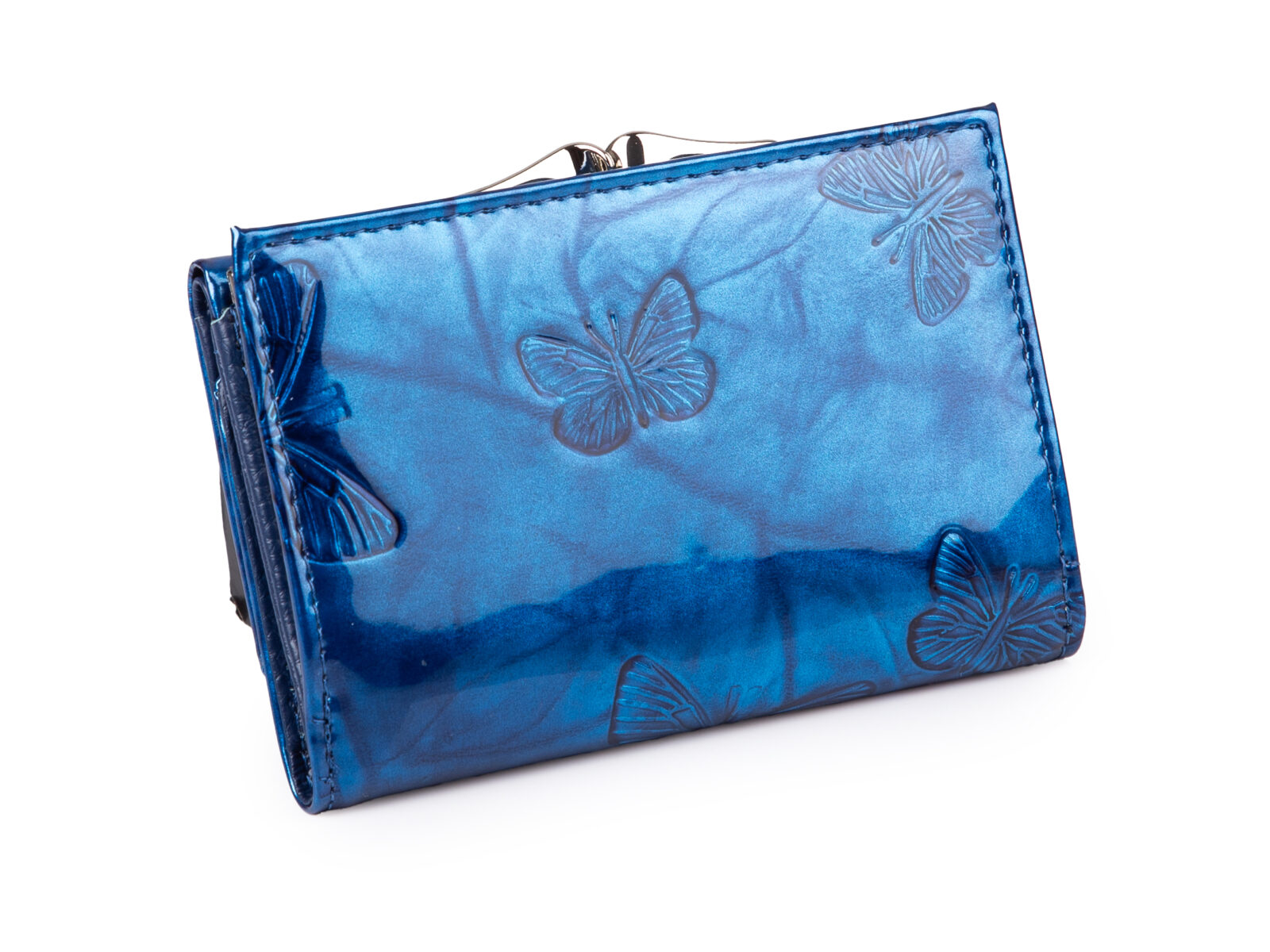 Lakierowany, średni portfel damski niebieski w motylki, zapinany na bigiel
