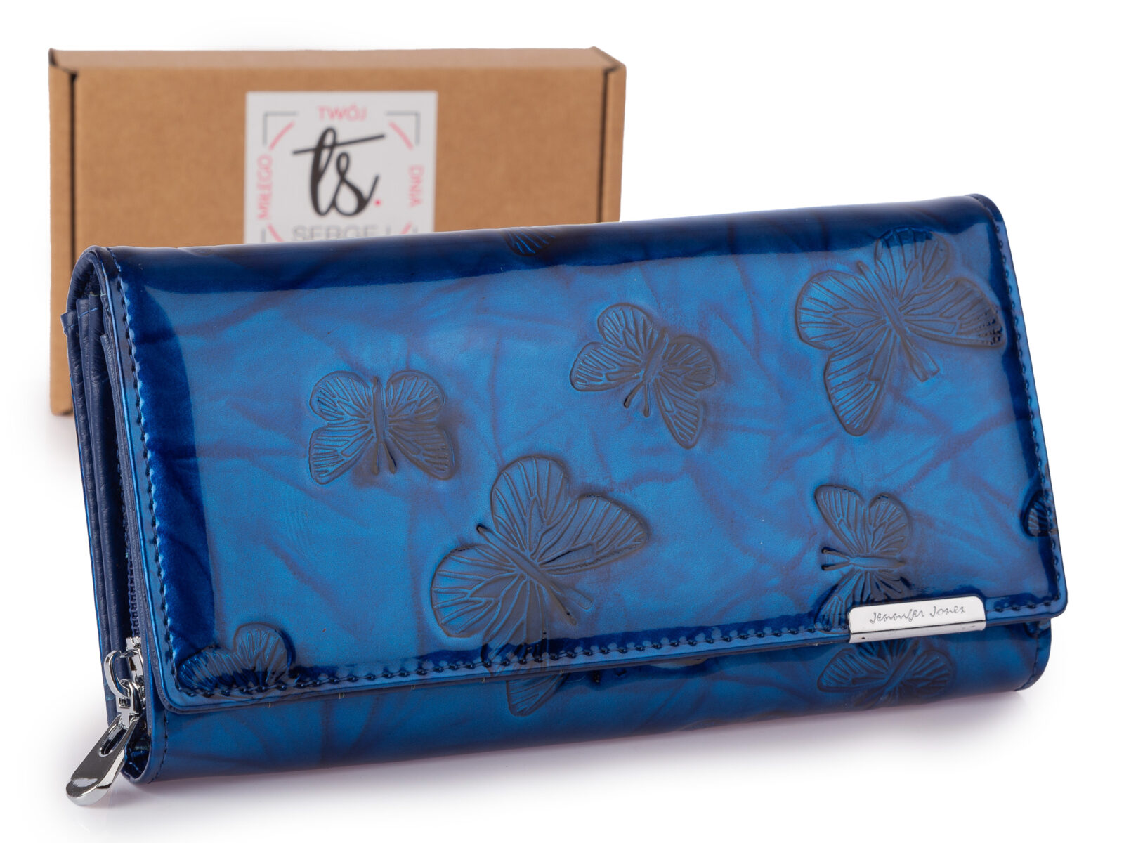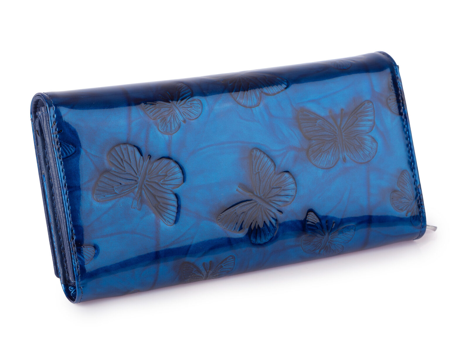 Duży poziomy portfel damski lakierowany z wzorem w tłoczone motylki niebieski