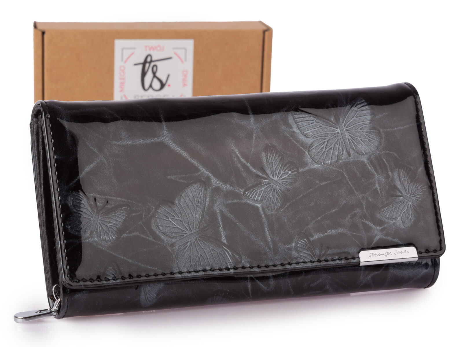 Duży poziomy portfel damski lakierowany z wzorem w tłoczone motylki czarny