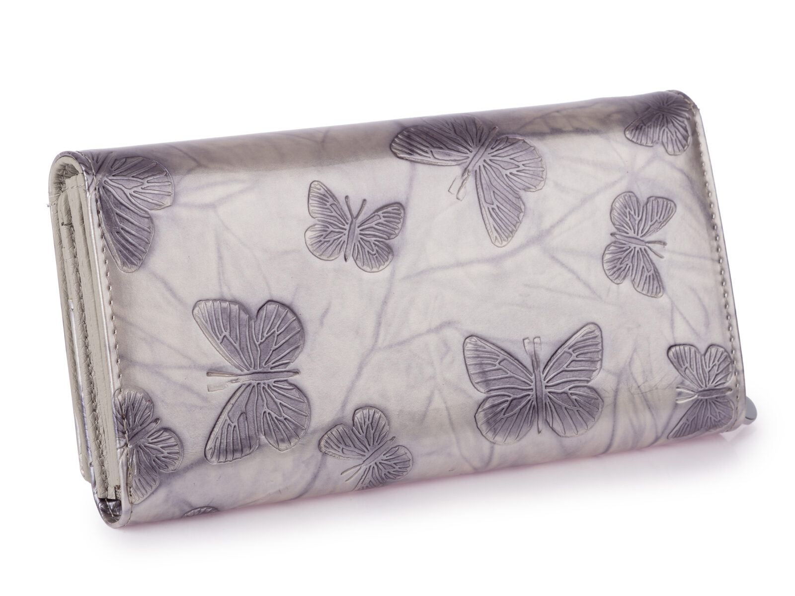 Duży poziomy portfel damski lakierowany z wzorem w tłoczone motylki srebrny