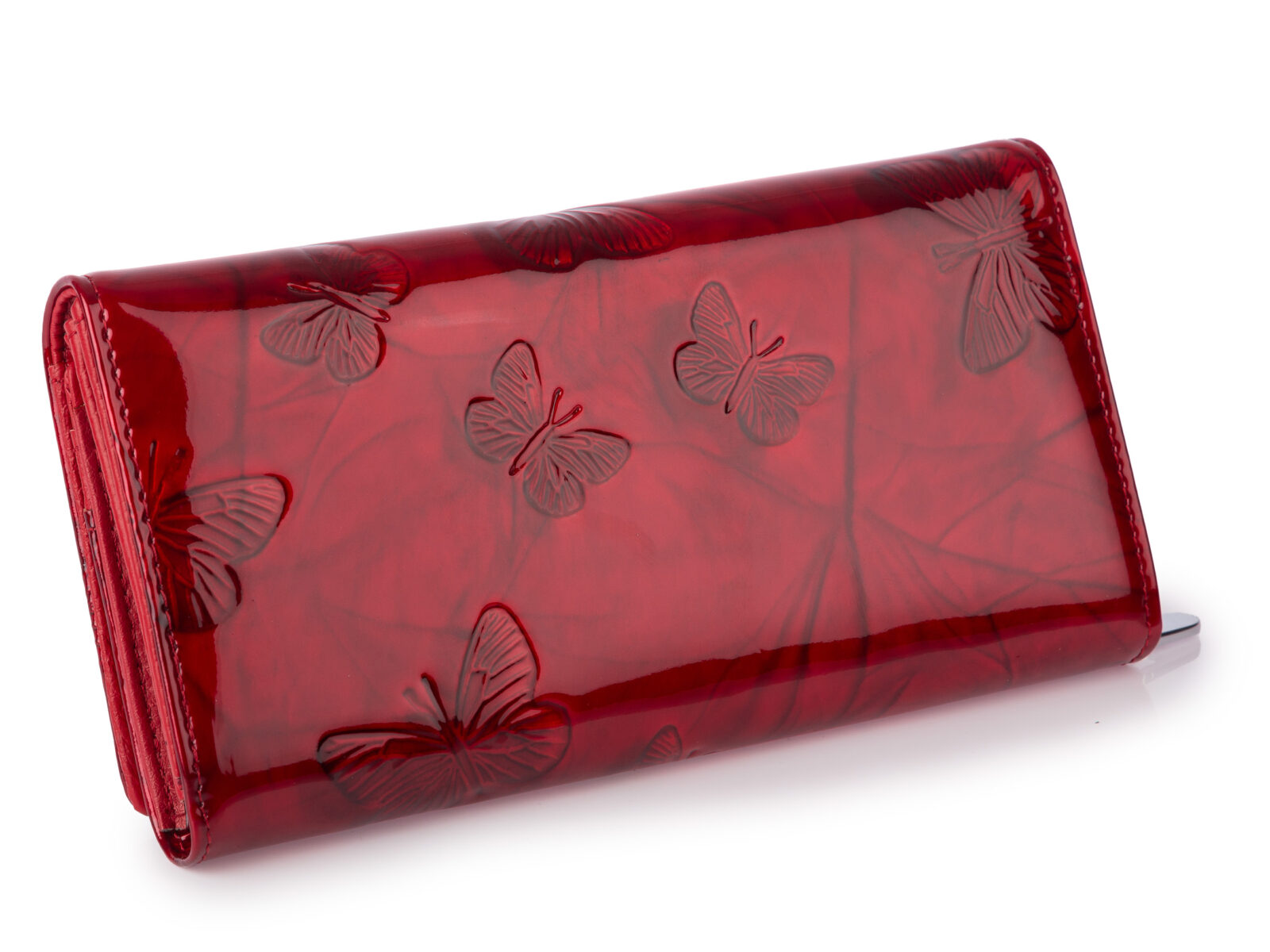 Duży poziomy portfel damski lakierowany z wzorem w tłoczone motylki czerwony