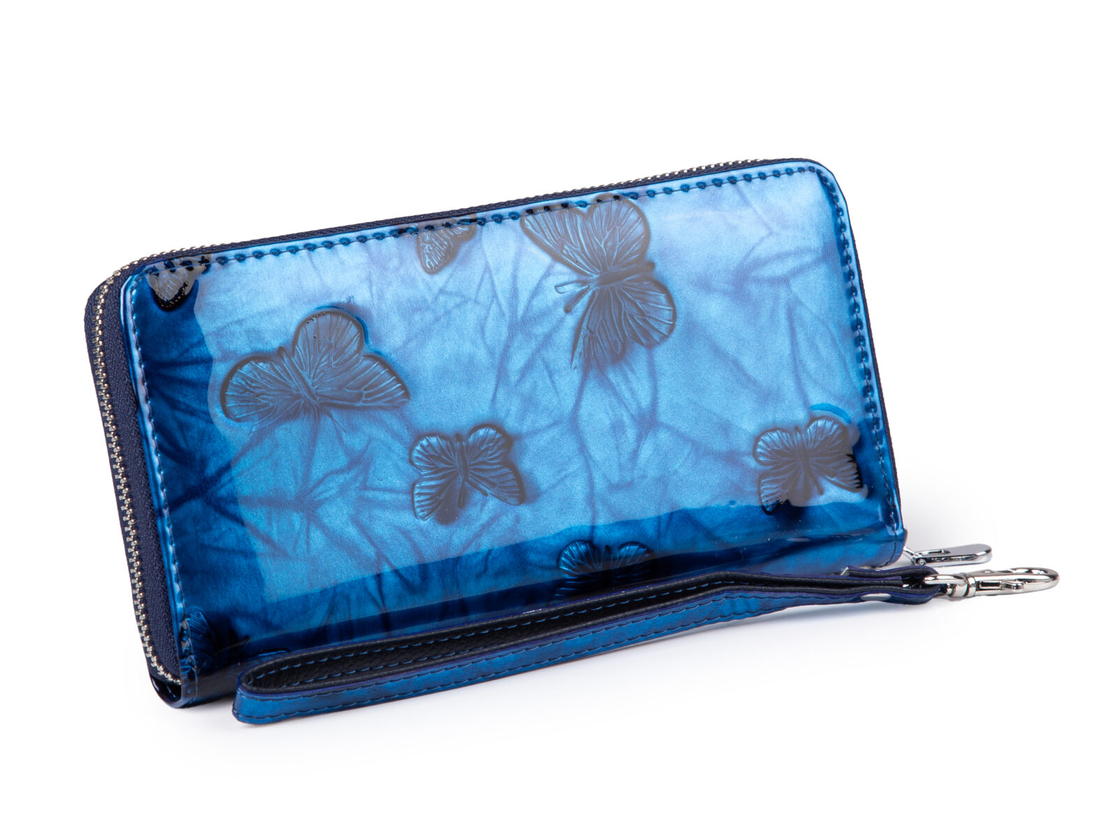 Duży niebieski portfel damski lakierowany w motylki zapinany dookoła na suwak z paskiem na rękę
