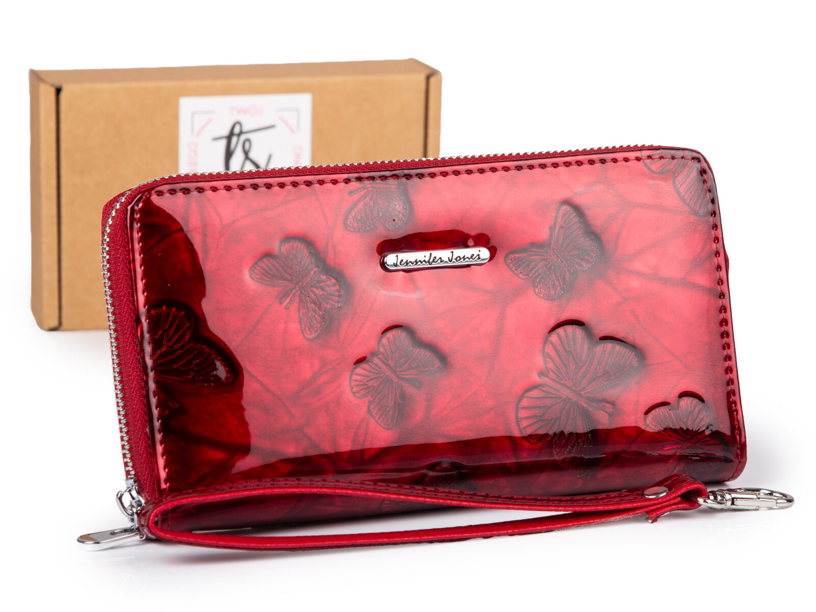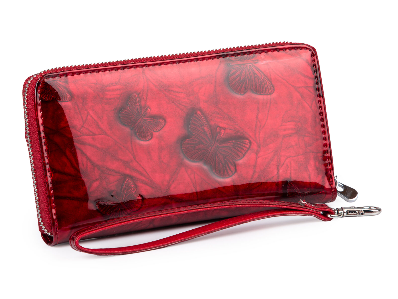 Duży czerwony portfel damski lakierowany w motylki zapinany dookoła na suwak z paskiem na rękę
