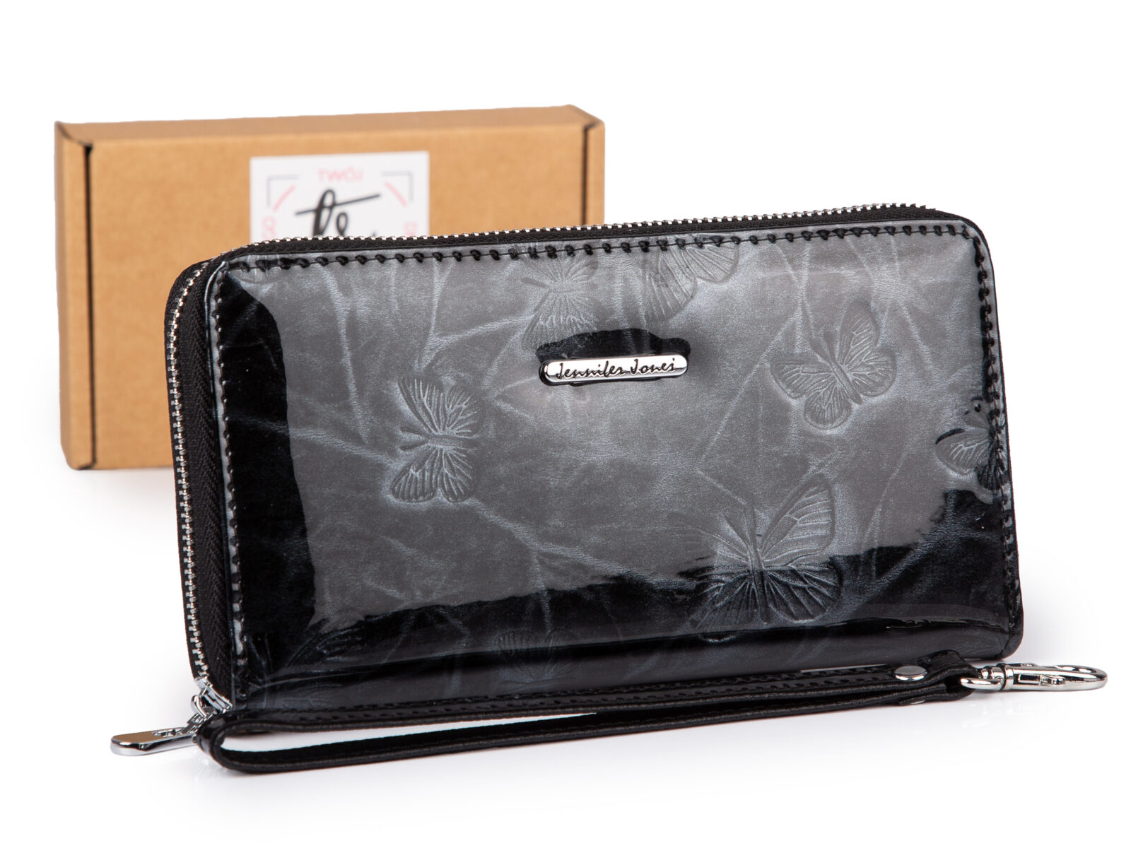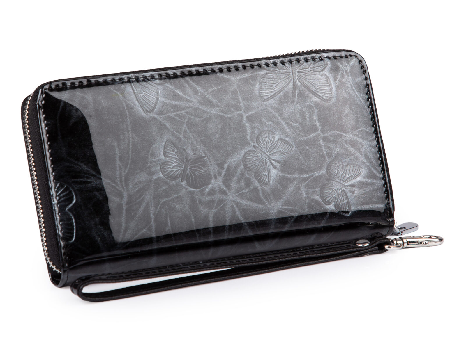 Duży czarny portfel damski lakierowany w motylki zapinany dookoła na suwak z paskiem na rękę