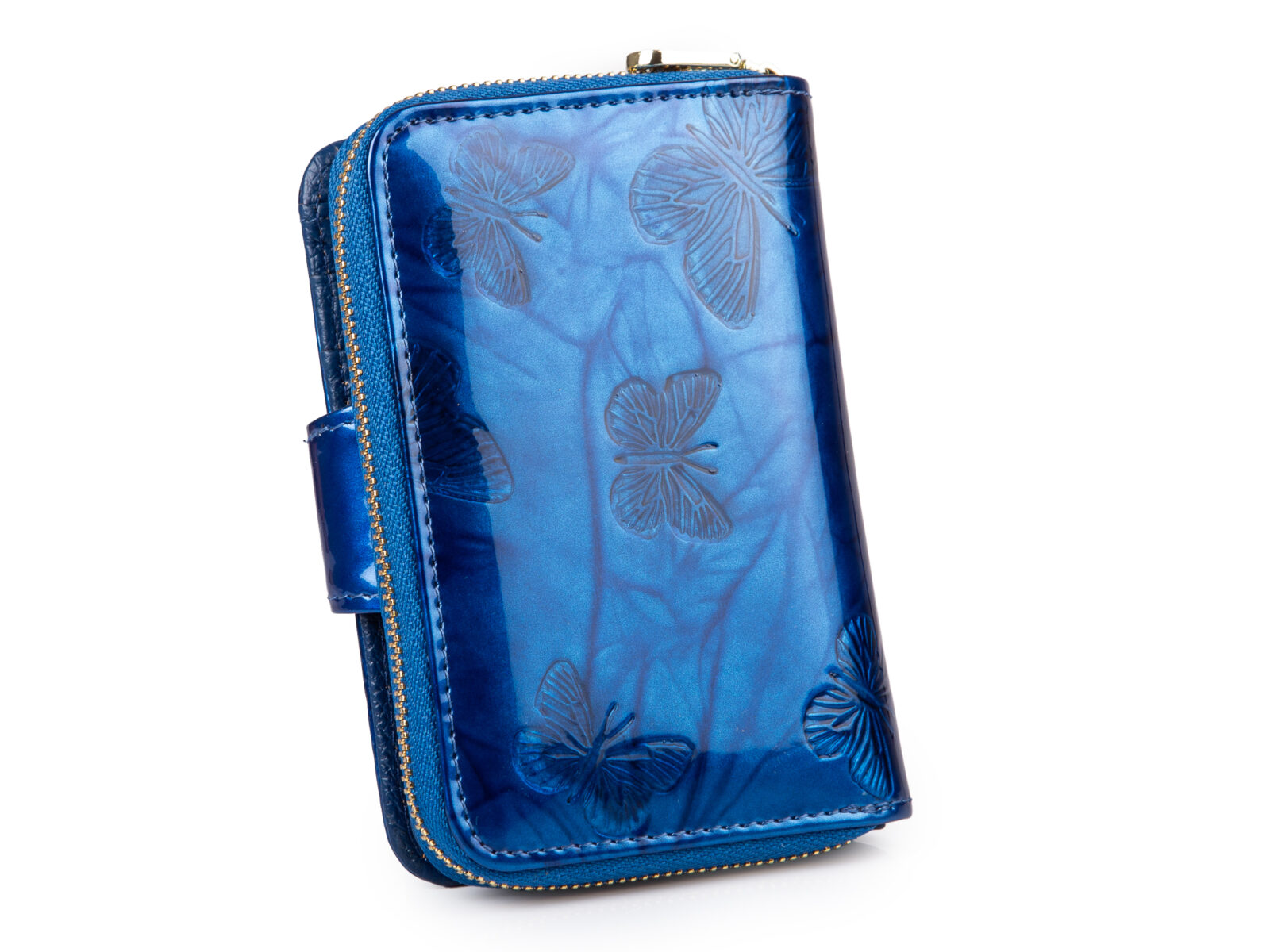 Portfel damski niebieski lakierowany z wzorkiem w motylki RFID Gregorio