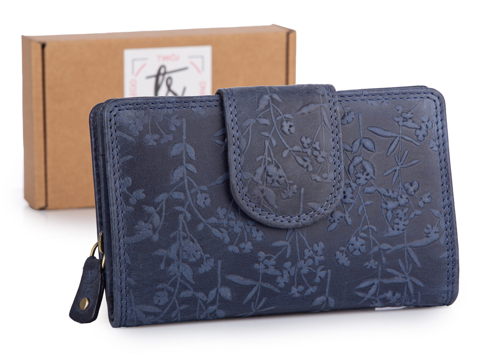 Pojemny, skórzany portfel damski granatowy z tłoczonym kwiatowym wzorem vintage