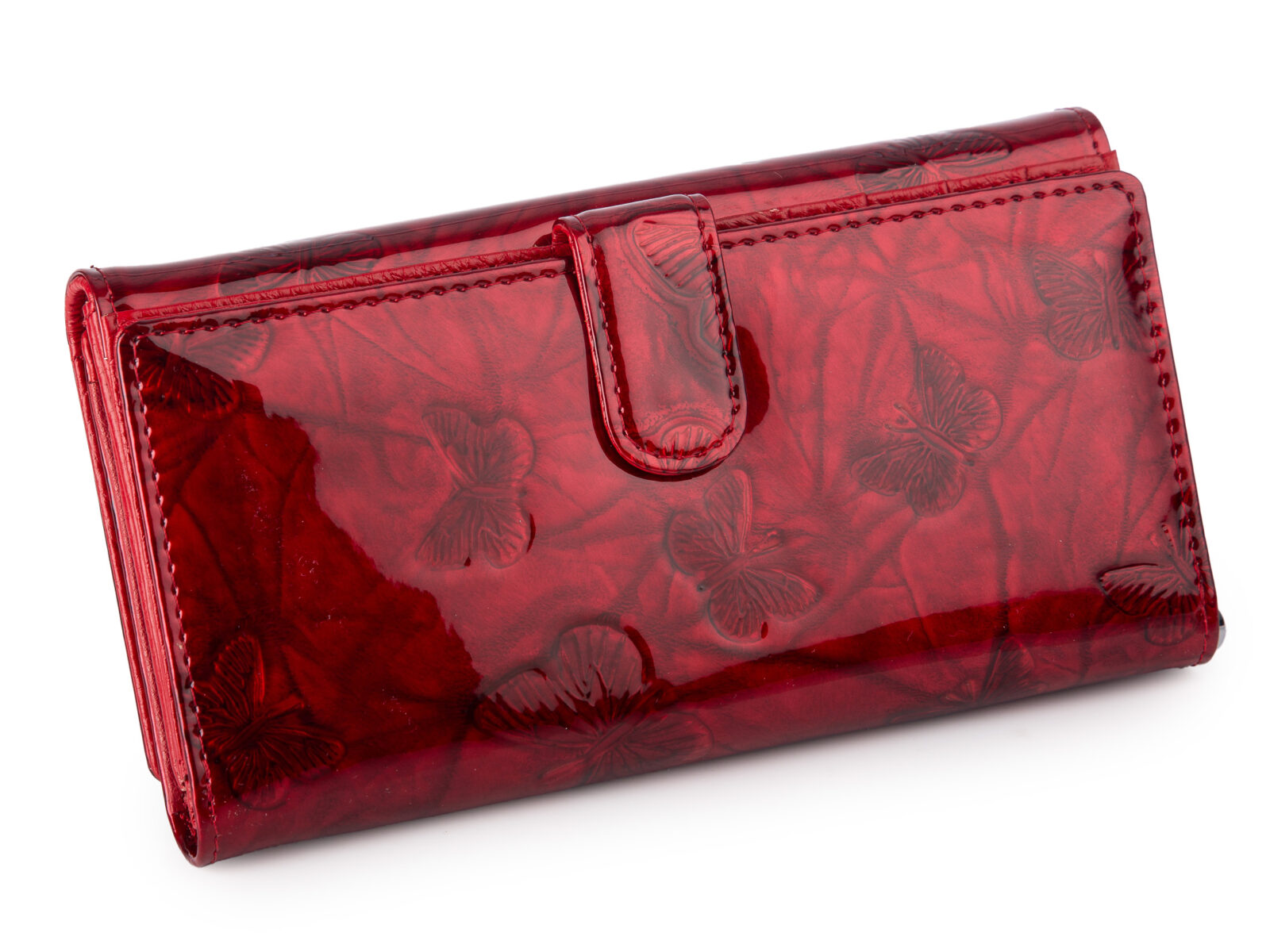 Duży portfel damski lakierowany w motylki, czerwony, skórzany z RFID