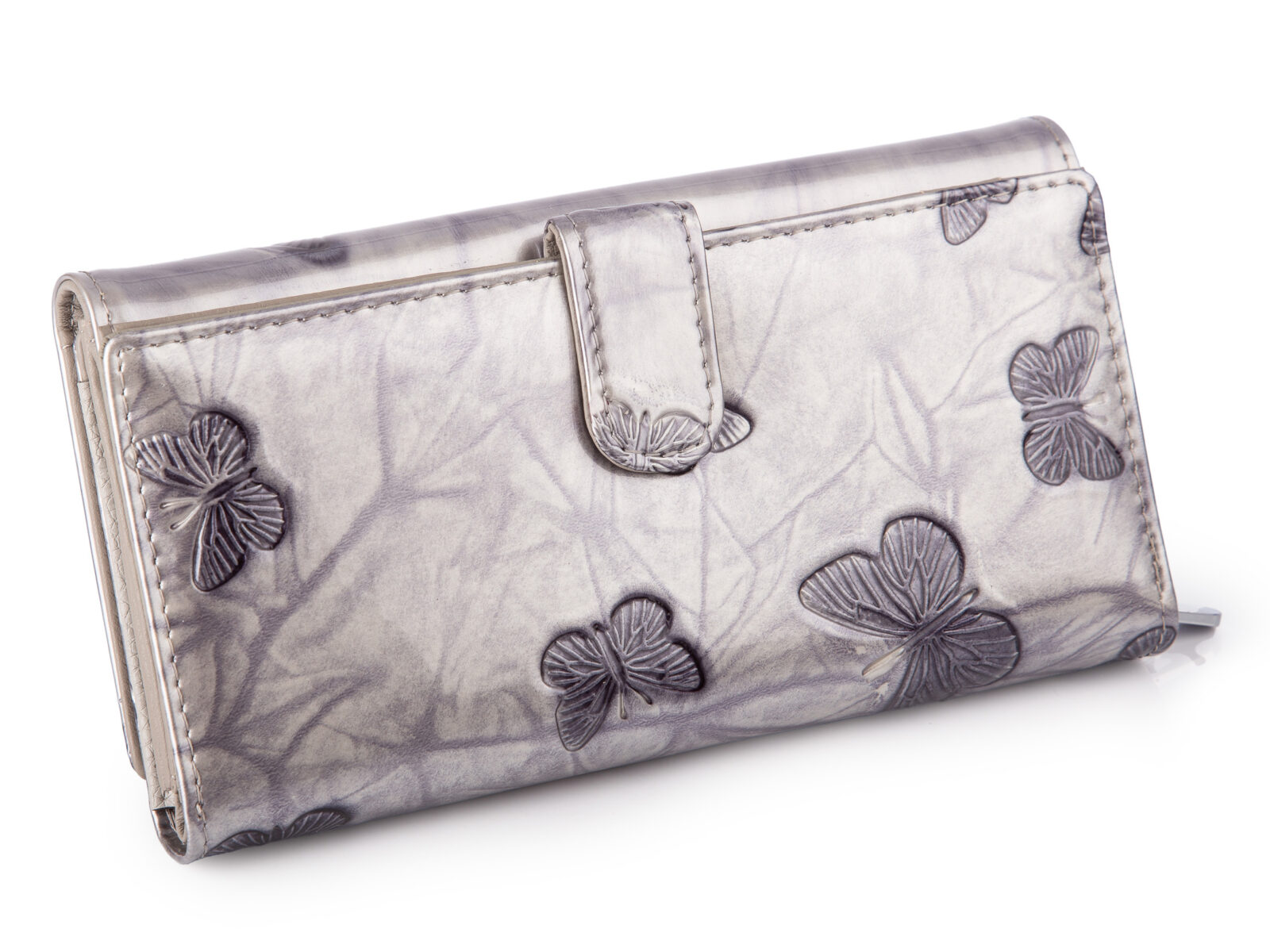 Duży portfel damski lakierowany w motylki, srebrny, skórzany z RFID