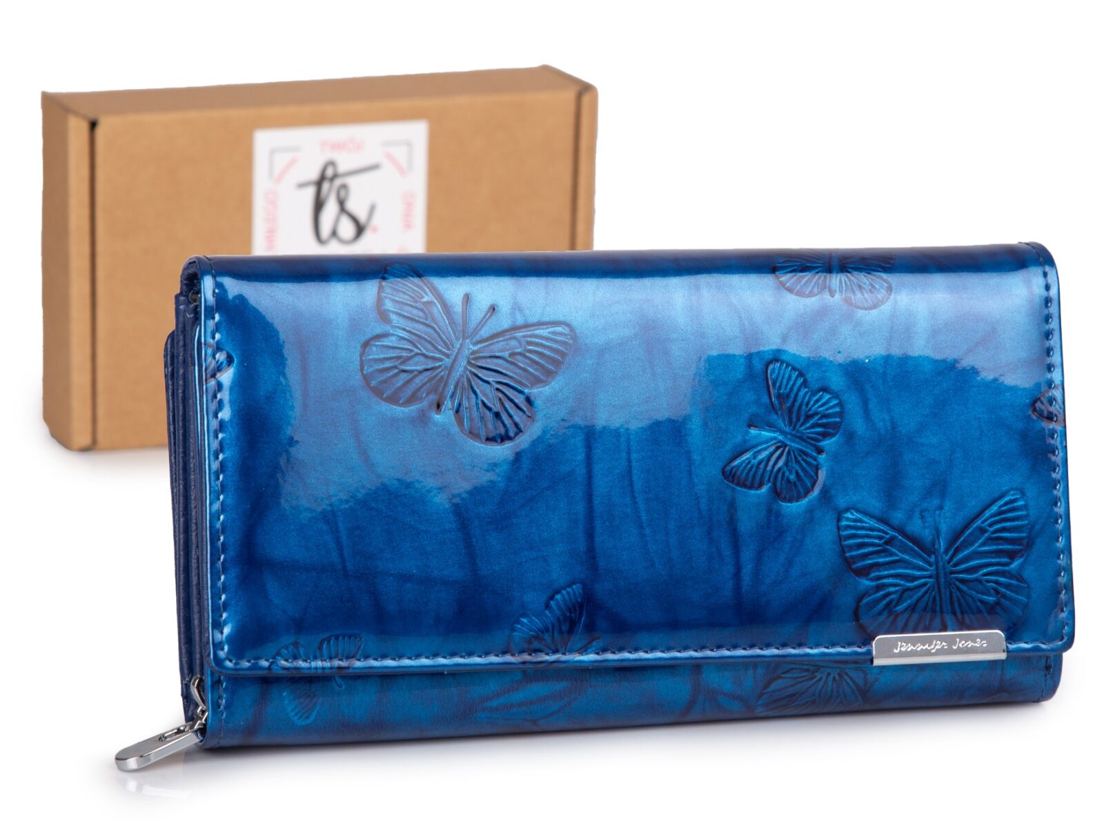 Duży portfel damski lakierowany w motylki, niebieski, skórzany z RFID