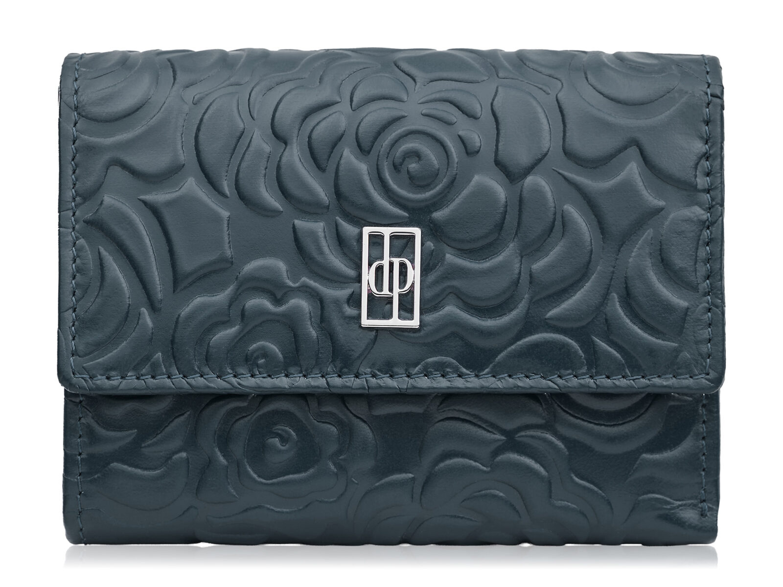 Granatowy, średni portfel damski skórzany z wzorem w tłoczone kwiaty RFID
