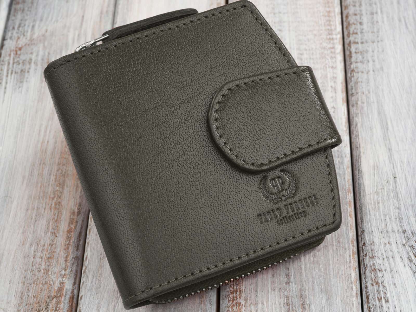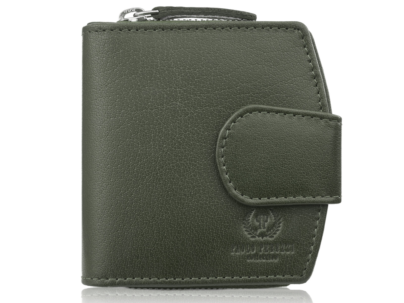 Ciemnozielony portfel damski skórzany średni zapinany na zatrzask i zamek błyskawiczny RFID